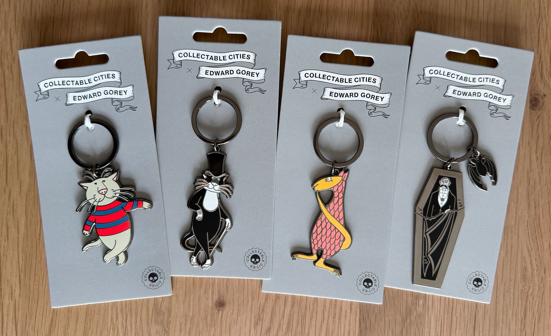 If the campaign reaches its stretch goal, collectors will also get a figure of Gorey himself — fur coat, cat companion, and all! Alongside the figures, Collectable Cities is releasing a key ring collection featuring characters like The Fantod, Gorey’s whimsical cats, and of course, Dracula (complete with a tiny bat charm). Each PVC figure is hand-finished with that same matte, museum-quality touch the studio is known for. Dracula stands 16x10cm tall, while Gorey measures 5x10cm and comes with a cat and book accessory. Key rings range from 6–7cm tall and are finished in black-nickel, presented on premium backing cards.