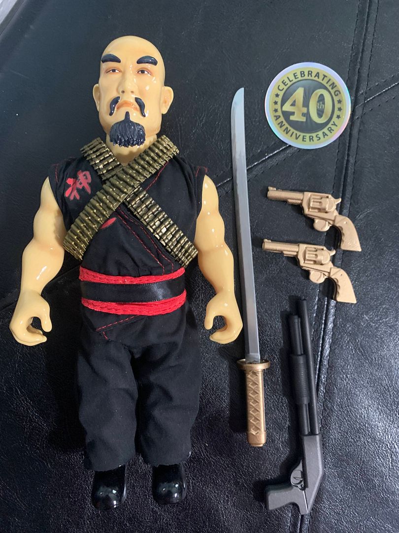 Standing 9" tall, this custom-made figure captures that hardened Wing Kong enforcer look with a stern sculpt, thick black eyebrows, pointed mustache and goatee combo, and crossed bullet bandoliers draped over a black gi with red accents. The detailing on the outfit gives it that gritty, street-level Chinatown energy that made the film so iconic.