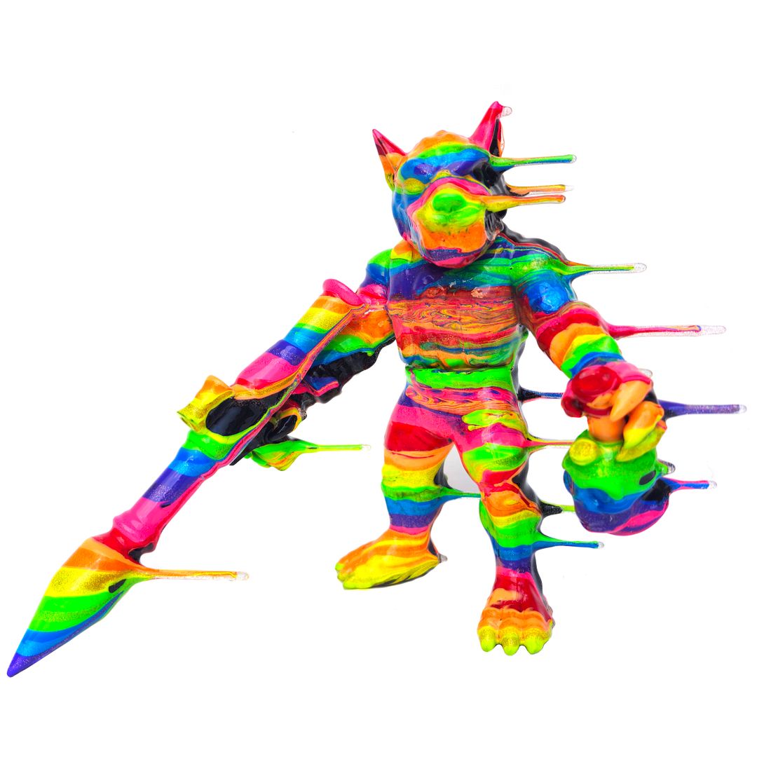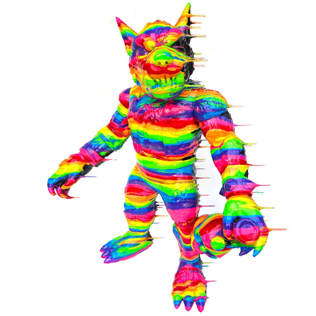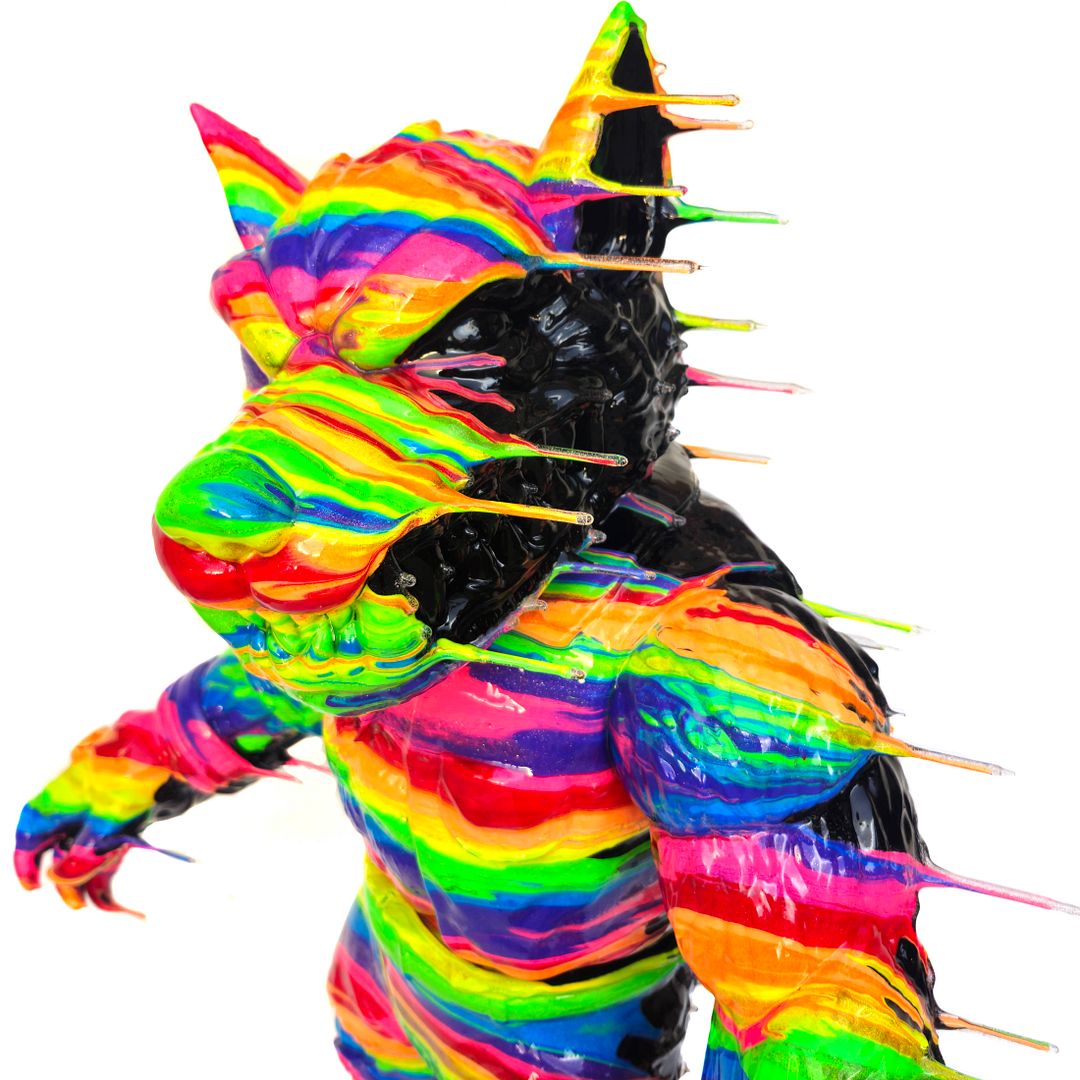 Dollar Slice Bootlegs has built a reputation on irreverent pop culture flips and gritty character energy rooted deep in the indie sofubi and resin world. That foundation is taken to another level here as Josh Mayhem amplifies each piece with his signature kinetic paintwork and high impact mixed media finish. The result is a series of Big Rad Wolf figures that look like they are literally tearing through space, color and dimension.