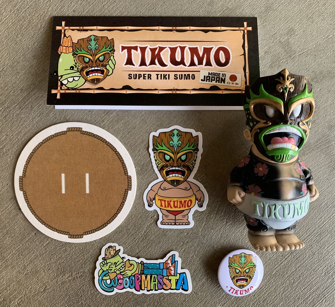 Standing 4.5 inches tall and produced in Japan using traditional sofubi vinyl, the TIKUMO figure fuses tiki-inspired aesthetics with the chunky presence of a sumo wrestler, creating a character that feels both mischievous and powerful. The sculpt features a bold tiki mask-style face, exaggerated expression, and stout sumo proportions, while the paint application leans into earthy tones accented by vibrant greens and floral details that give the piece its distinct personality.